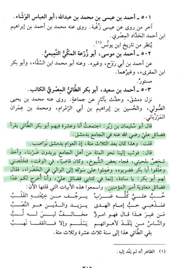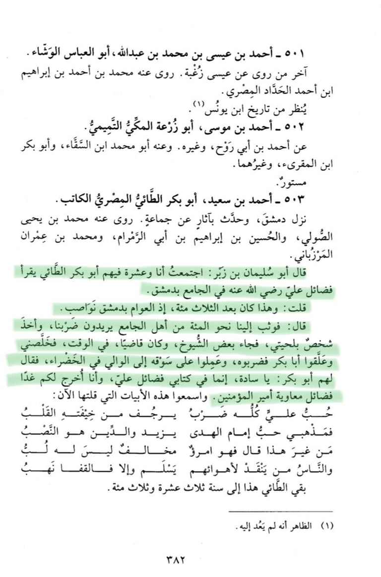 Abu Sulaiman bin Zabr berkata: Aku bersama sepuluh orang lainnya—di antaranya adalah Abu Bakar al-Tha'i—pernah berkumpul sambil membaca keutamaan-keutamaan ‘Ali bin Abi Thalib radhiyallahu ‘anhu di Masjid Jami‘ Damaskus.